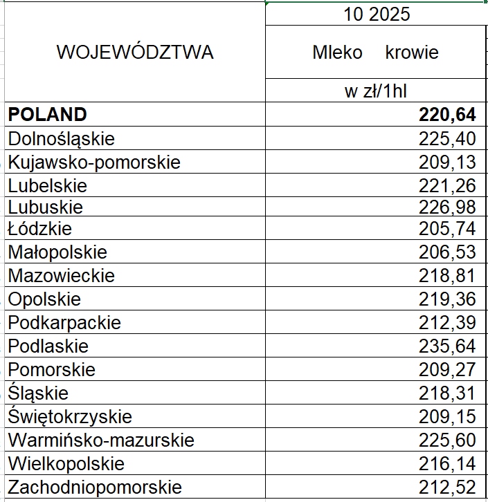 Według Głównego Urzędu Statystycznego cena skupu mleka w październiku 2025 r. wyniosła 220,64 zł /1 hl i była wyższa o 0,2 % niż w październiku 2024 r. Cena skupu mleka w odniesieniu do września 2025 r. była o 1,3 % niższa.