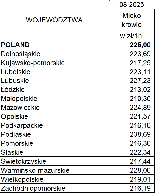 Według Głównego Urzędu Statystycznego cena skupu mleka w sierpniu 2025 r. wyniosła 225,00 zł /1 hl i była wyższa o 12,2% niż w sierpniu 2024 r. Cena skupu mleka w odniesieniu do lipca 2025 r. była o 0,9 % wyższa.