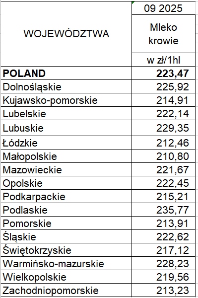 Według Głównego Urzędu Statystycznego cena skupu mleka we wrześniu 2025 r. wyniosła 223,47 zł /1 hl i była wyższa o 7,3% niż we wrześniu 2024 r. Cena skupu mleka w odniesieniu do sierpnia 2025 r. była o 0,7 % niższa.